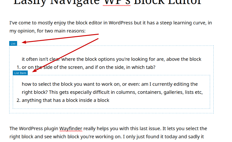 - how to select the block you want to work on, or even: am I currently editing the right block? This gets especially difficult in columns, containers, galleries, lists etc, anything that has a block inside a block